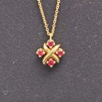 Xのモチーフと4つのルビーが特徴的なネックレスです。