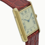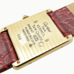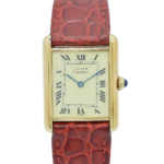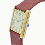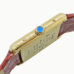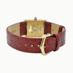 ・ケース素材はヴェルメイユ(Silver925に金メッキ)で、金色の温かみある光沢が特徴です。タンクらしい直線的な長方形ケースとラグの構成がクラシックな印象を与えます。サイズは縦約30.5mm×横約23.5mm(LM相当)で、ドレス寄りのコンパクトなフォルムです。