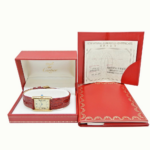 多くはレザーストラップ(社外品の場合あり)に純正または金メッキの尾錠が組み合わされます。販売個体によってはストラップ交換済みのものが多く、尾錠の有無や純正性は確認ポイントです。