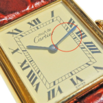 ヴェルメイユ特有のゴールド調の高級感が魅力ですが、経年でメッキの摩耗や剥がれが出やすいため、ケース縁や裏蓋、ラグのメッキ状態を必ず確認してください。良好なメッキ残存は個体価値に直結します。