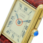 色味はアイボリー〜シャンパン系が多く、ローマ数字とレールミニッツ(分目盛り)など伝統的なカルティエデザインを採用しています。風防はミネラルガラスが使われる個体が多く、視認性とクラシックさを両立しています。