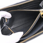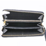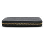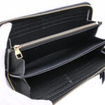シンプルながらも高級感のあるブラックレザーに、ゴールド金具がアクセントとして映えるデザイン。ラウンドファスナータイプで大きく開き、中身が見やすく取り出しやすいのも魅力です。収納力も抜群で、カードやレシートが多くなりがちな方にもおすすめ。
